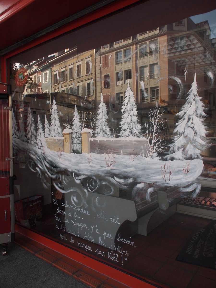 Под рождество расписывают ещё и витрины — такое можно было увидеть у многих магазинов и организаций. Ну и конечно же, красные человечки.