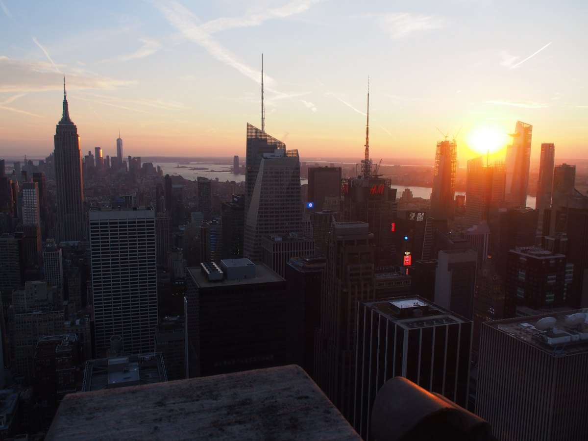 У меня был специальный билет на два посещения — дневное и вечернее. Поэтому, погуляв по городу, я вернулась на Top of the Rock ещё раз — смотреть вечереющее небо, закат и огни города.