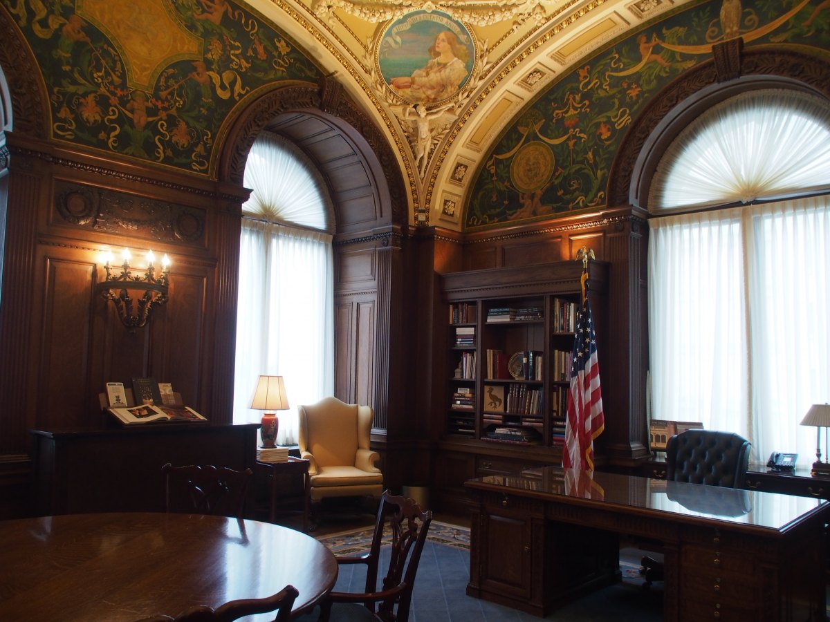 Читальный зал, на который можно посмотреть сверху сквозь стекло. На витражах — печати штатов, на балюстраде — бронзовые скульптуры выдающихся деятелей: Моисей, Колумб, Геродот, Бетховен, Платон, Гомер, Ньютон и другие.