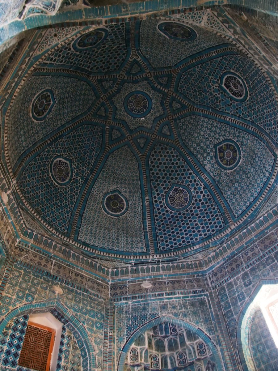 Мавзолей Шодимулк око. Воздвигнут в 1372 году, в честь сестры Тимура Туркон око и её дочери Шоди Мулк око. Деталь снаружи и купол внутри.